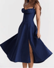 Das Kleid aus weichem Polyester in einem wunderschönen Blauton hat ein körpernahes Korsett, das mit einem schönen Rückenausschnitt mit Spitze verziert ist. Die geraffte Brust wird mit einem Kordelzug zusammengehalten und der seitliche Schlitz sorgt für einen Hauch von Sexappeal, da er ein Stück Bein enthüllt.